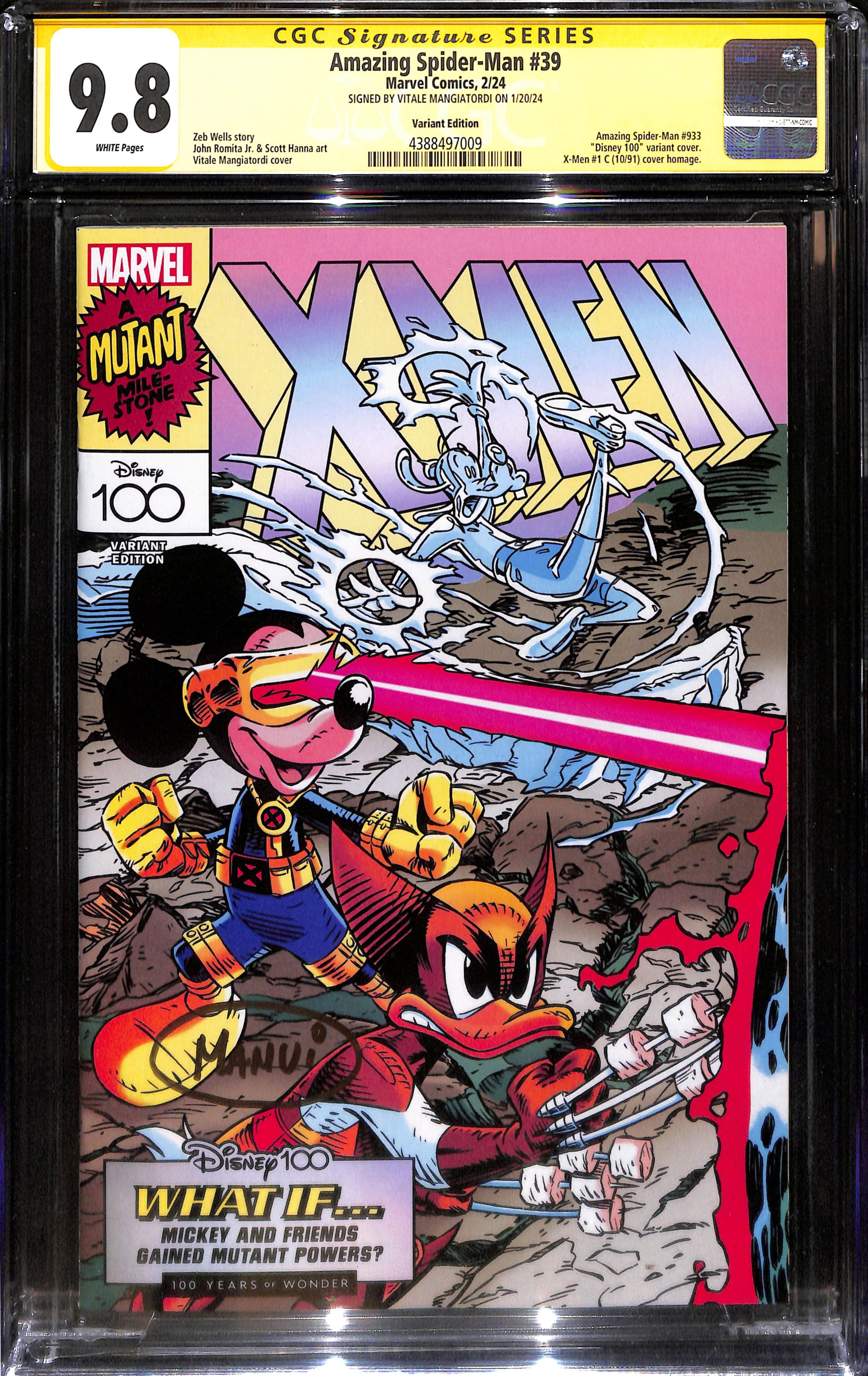 Amazing Spider-Man #39 (02/2024) presenta la copertina esclusiva “Disney 100” illustrata e firmata da Vitale Mangiatordi il 20/01/2024. Questa edizione è un tributo diretto alla leggendaria cover di X-Men #1 C (1991), reinterpretata in una nuova versione omaggio.