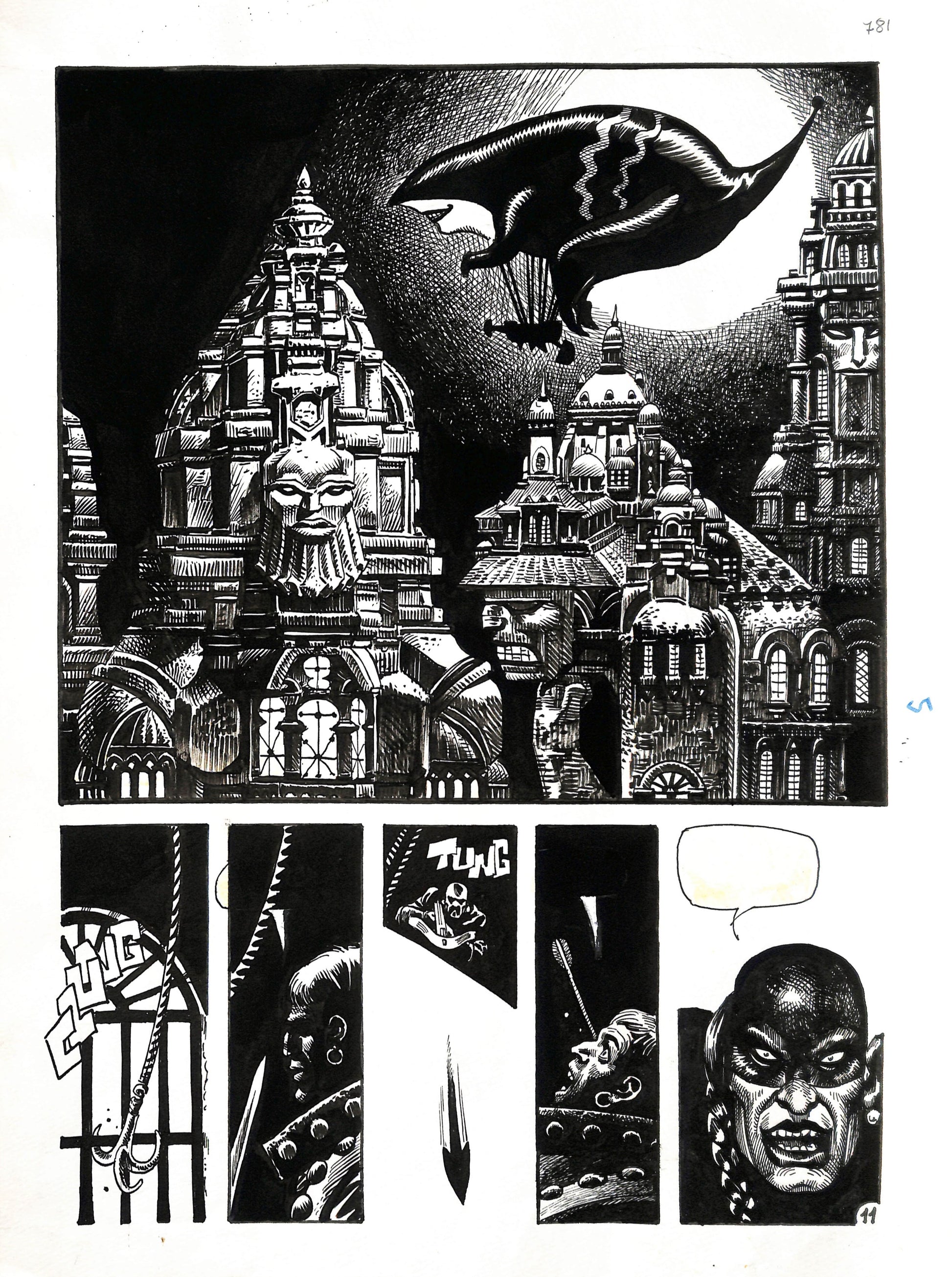 Questa tavola originale firmata Enrique Alcatena, realizzata negli anni '70, rappresenta un esempio prezioso del primo periodo creativo di uno degli artisti più visionari e riconoscibili del fumetto argentino. Il tratto già potente e ricco di dettagli testimonia lo stile inconfondibile che avrebbe reso Alcatena celebre a livello internazionale negli anni successivi, anche attraverso le sue collaborazioni con DC Comics, Marvel, e molte case editrici europee.