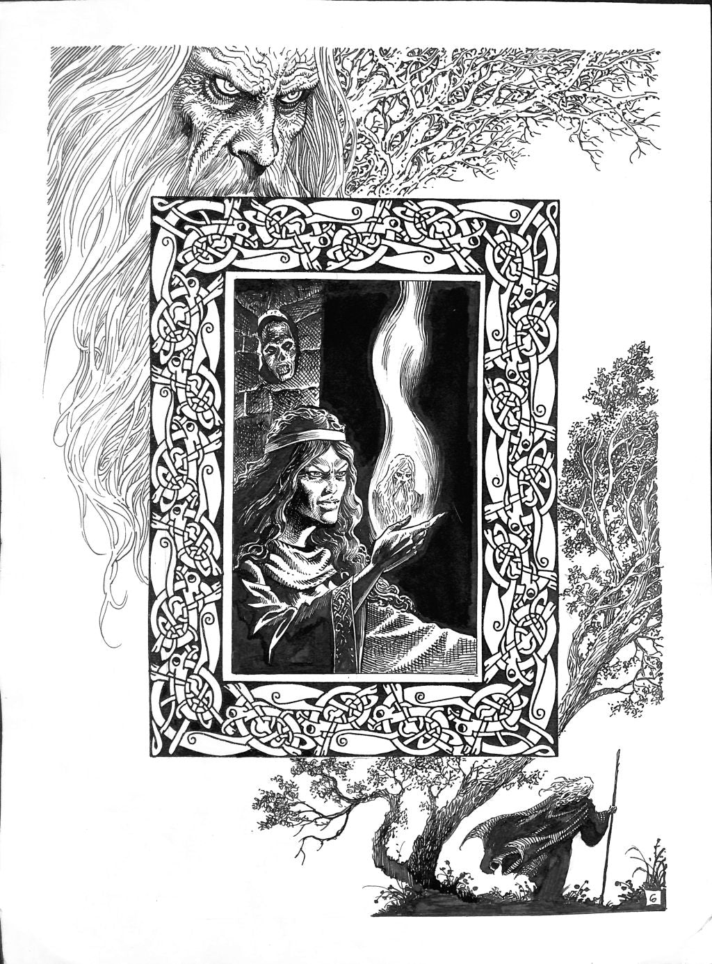 Tavola originale realizzata da Enrique Alcatena, maestro argentino dell’illustrazione fantastica, per il suo capolavoro grafico "Merlino", pubblicato nel 1994. In questa straordinaria pagina, il tema della magia prende forma attraverso il tratto minuzioso, potente e visionario che ha reso celebre l’artista a livello internazionale.