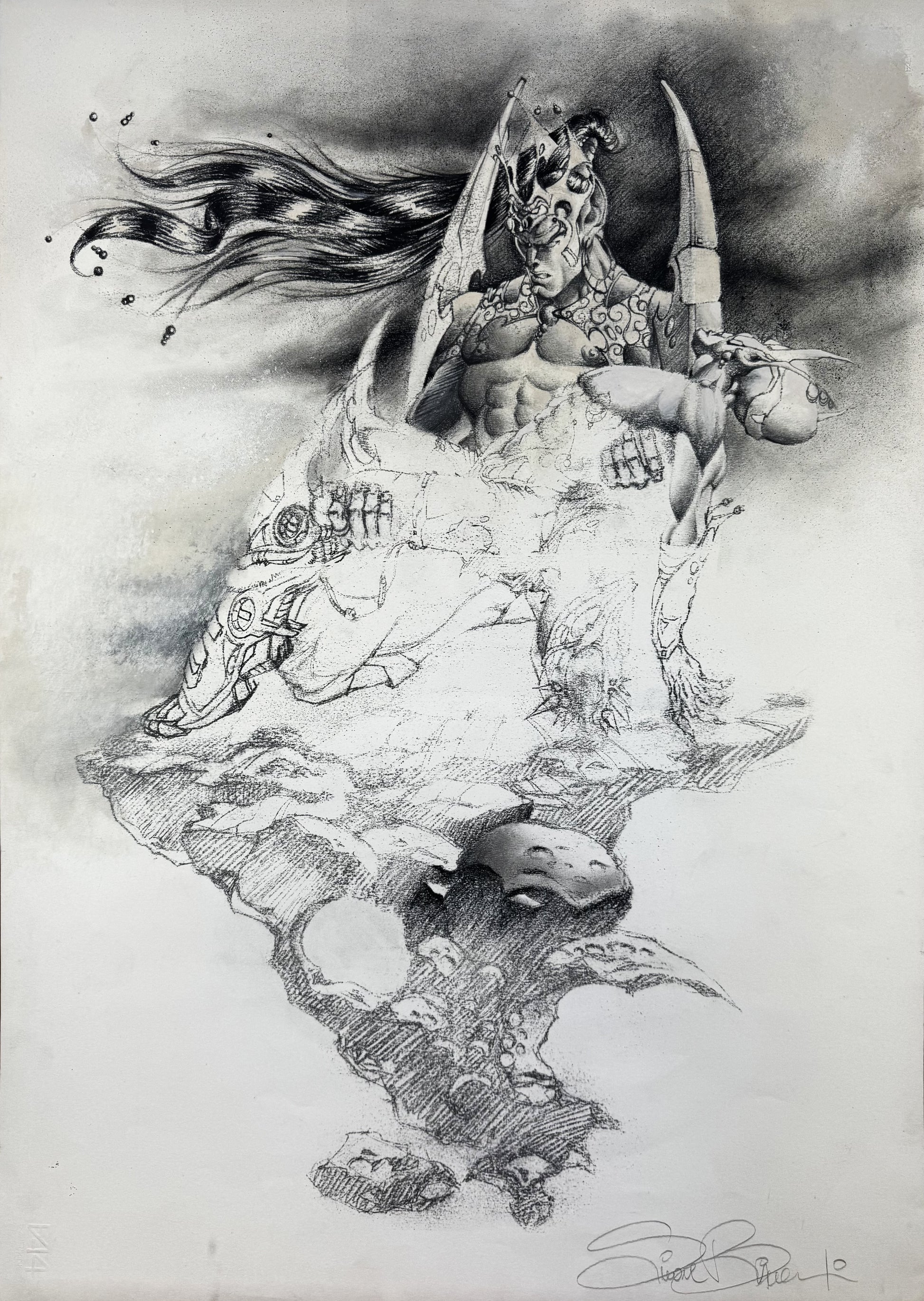 Imponente e ricercata tavola originale firmata da Simone Bianchi, uno degli autori e illustratori italiani più apprezzati a livello internazionale. Realizzata nel 1999, quest’opera appartiene al primo periodo artistico di Bianchi, antecedente alla sua collaborazione con i grandi editori statunitensi come Marvel Comics e DC Comics, e riflette già il suo stile inconfondibile, fatto di dinamismo, forza pittorica e un uso raffinato del chiaroscuro.